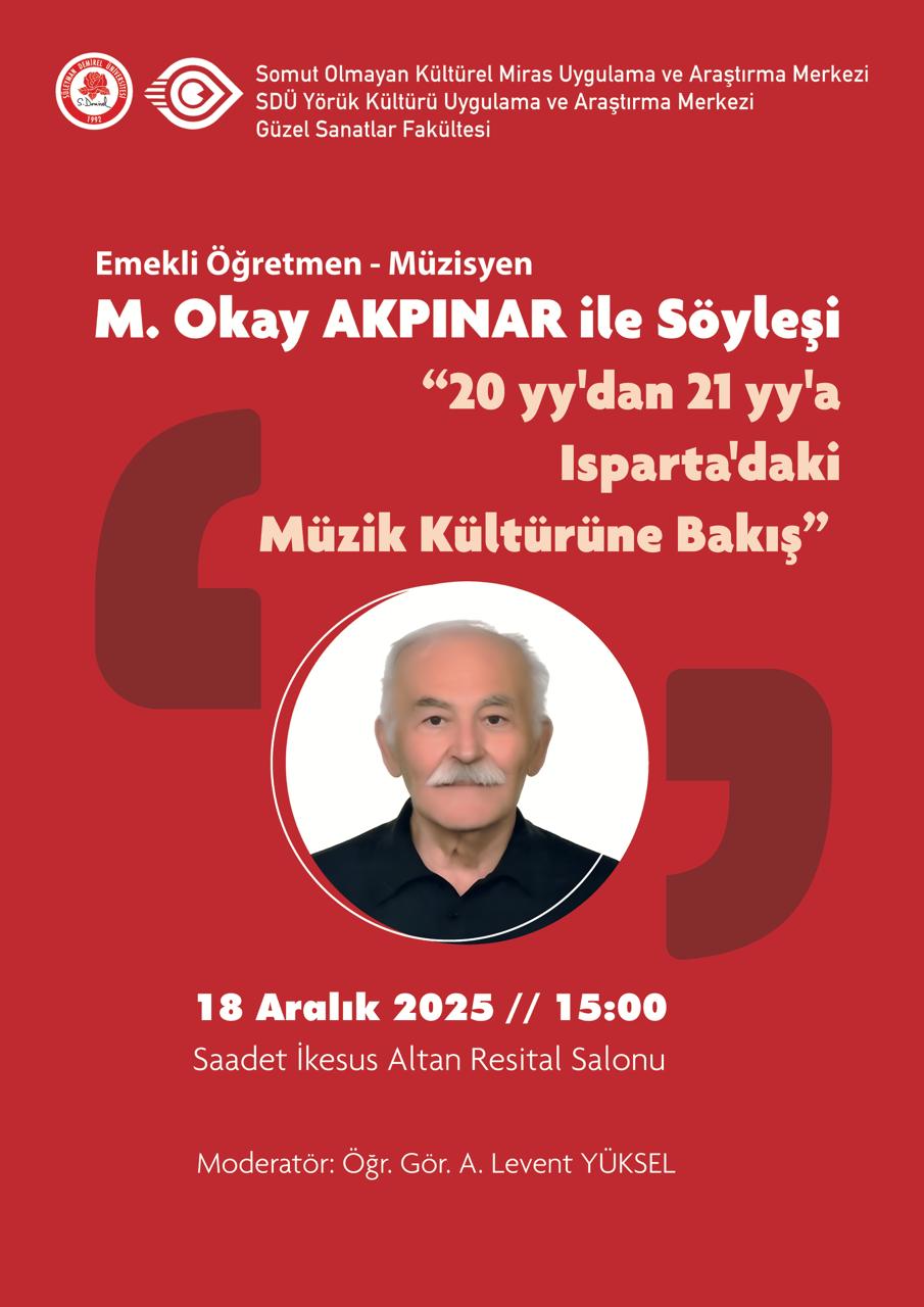 Süleyman Demirel Üniversitesi (SDÜ) Güzel Sanatlar Fakültesi (GSF), Somut Olmayan Kültürel Miras Uygulama ve Araştırma Merkezi (SOKÜM) ve Yörük Kültürü Uygulama ve Araştırma Merkezi (YORKAM) iş birliği ile emekli öğretmen- müzisyen M. Okay Akpınar ile söyleşi etkinliği düzenlendi.