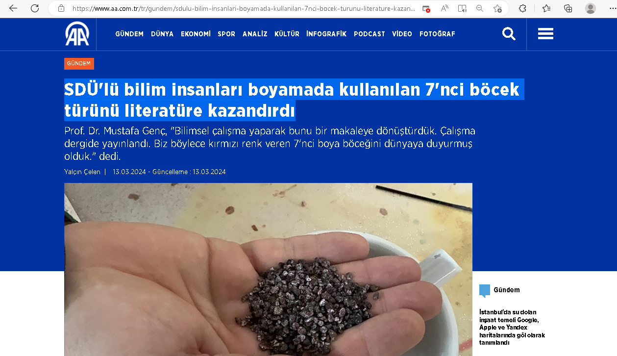 Dünya'da 6 tür böcek ve deniz salyangozu renk elde etmek üzere bütünleşik tekstil endüstrisinde kullanılıyor. SDÜ uzun yıllar süren saha araştırması ve bilimsel deneyler ışığında renk elde edilen 7'nci boya böceği keşfetti. Kırmızı renk elde edilen koşnil böceği türüne ilişkin bilimsel veriler yayımlanan akademik makale ile Dünya literatürüne kazandırıldı.