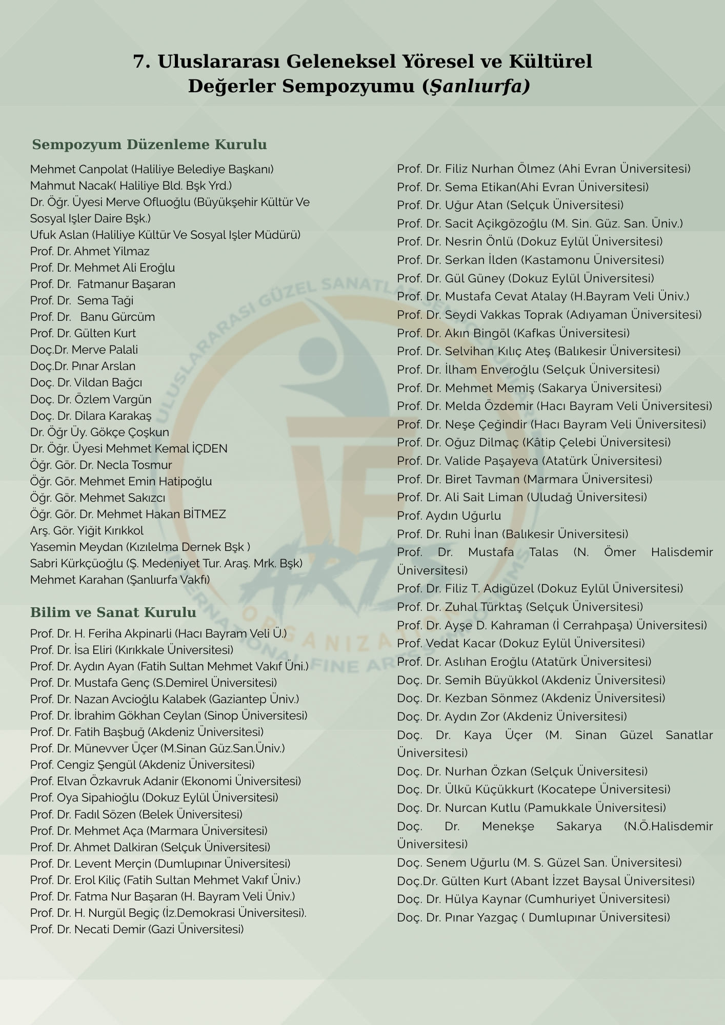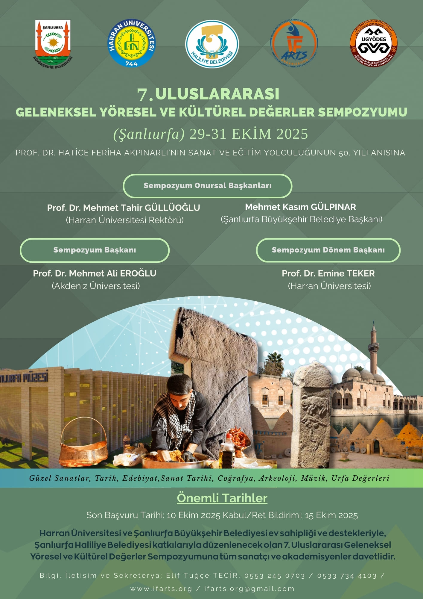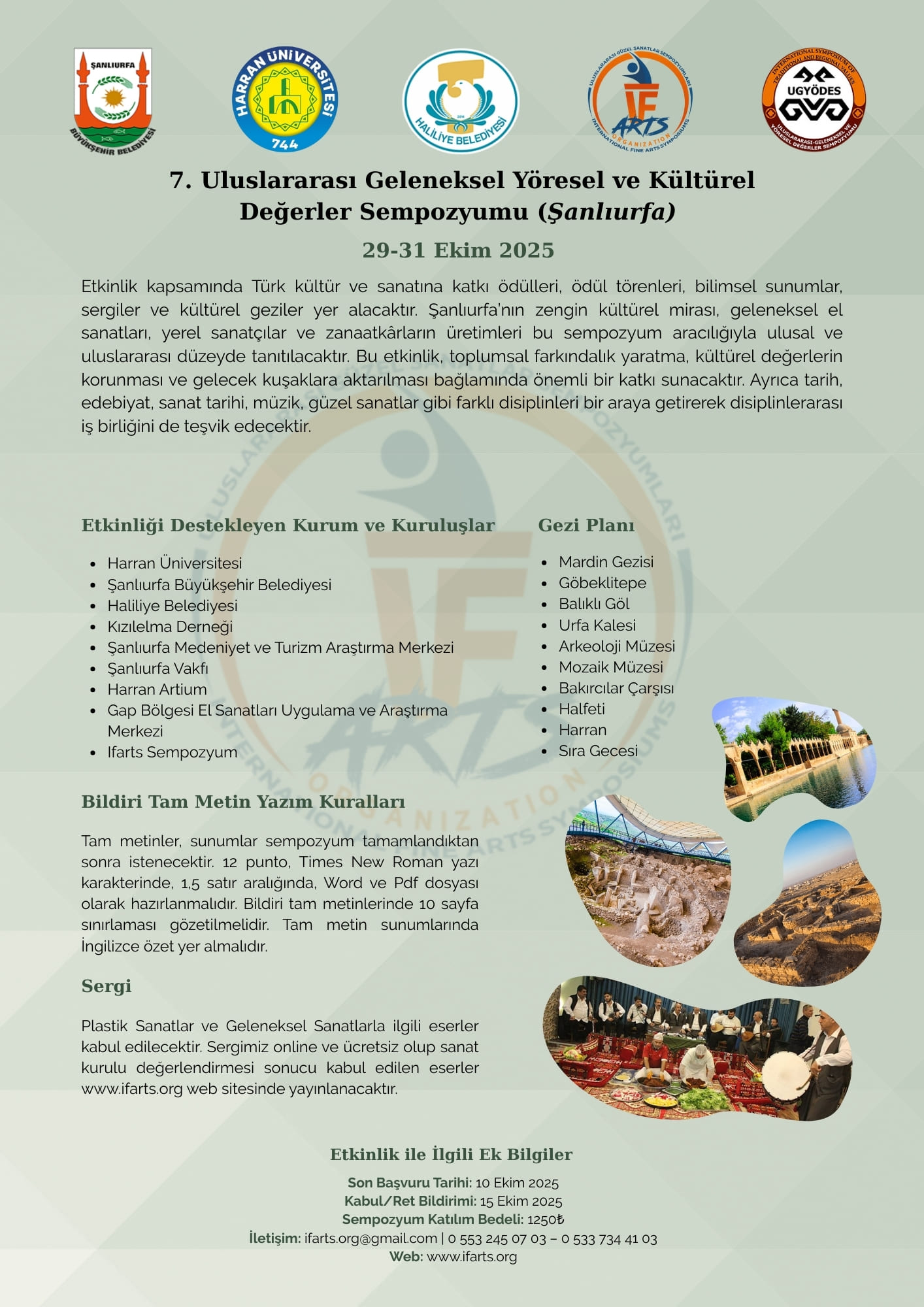 7. Uluslararası Geleneksel, Yöresel ve Kültürel Değerler Sempozyumu, 29-31 Ekim 2025 tarihleri arasında Harran Üniversitesi ev sahipliğinde gerçekleştirildi.