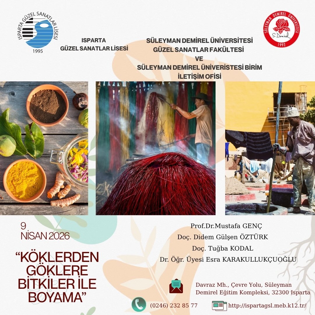 Bu bağlamda SDÜ Öğretim Üyesi Prof. Dr. Mustafa Genç, Doç. Didem Gülşen Öztürk, Doç. Tuğba Kodal ve Dr. Öğretim Üyesi Esra Karakullukçuoğlu, 9 Nisan 2026 Perşembe tarihinde, Isparta Güzel Sanatlar Lisesi'nde ''Köklerden Göklere: Bitkiler ile Boyama'' başlıklı iki farklı etkinlik düzenledi.