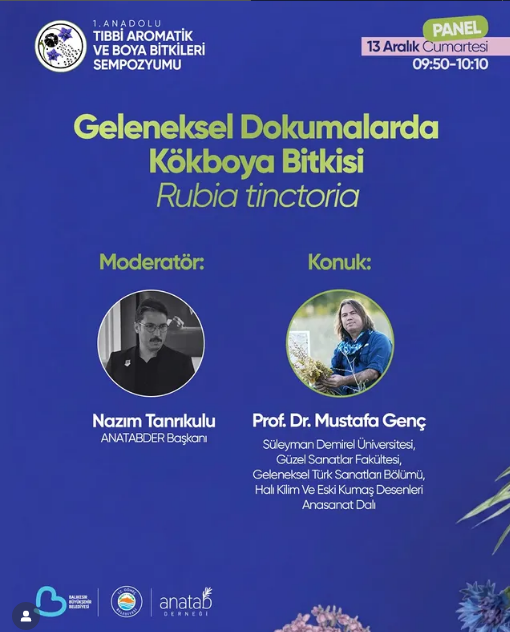 Prof. Dr. Mustafa Genç, I. Anadolu Tıbbi Aromatik ve Boya Bitkileri Sempozyumu'nda ''Geleneksel Dokumalarda Kökboya Bitkisi (Rubia tinctoria)'' konusunu işledi. Genç ayrıca '' Türk Dokuma Kültüründe Kökboya Etkileşimli Atölye'' düzenledi.
